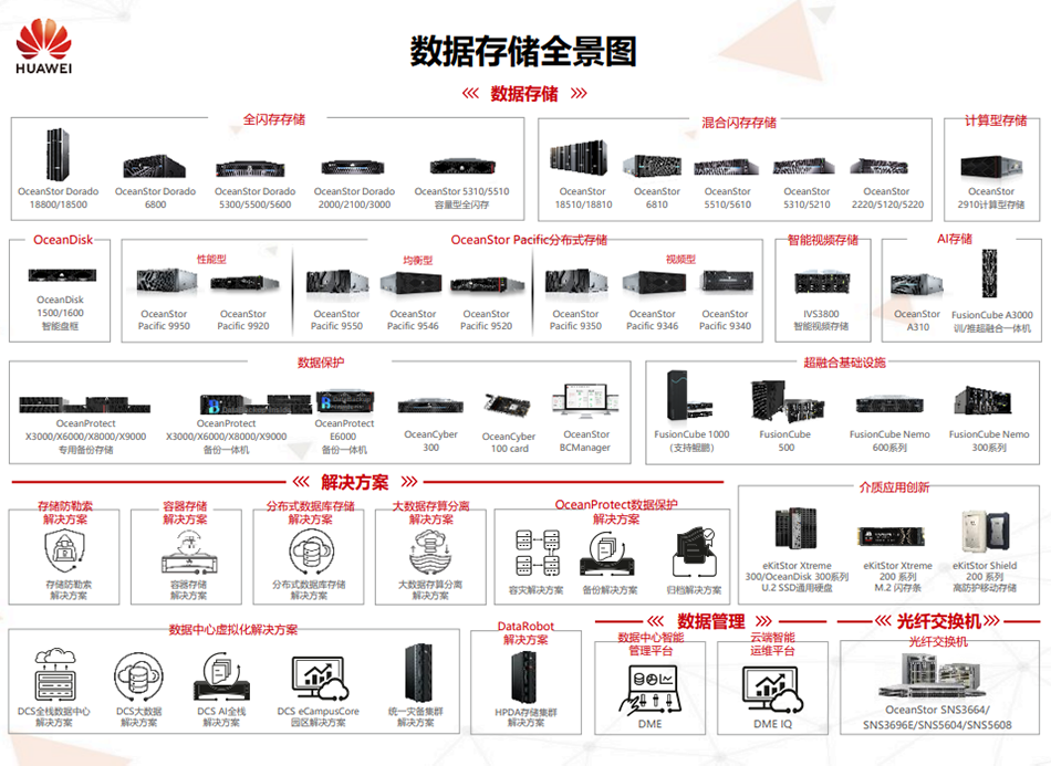 华为闪存,华为混合存储,华为分布式存储,华为备份;华为防勒索解决方案;华为DCS全栈数据中心解决方案。